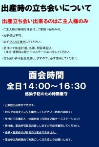 【出産時の立ち会いについて】 出産立ち会い出来るのはご主人様のみ。 院内では必ずマスクを着用してください。 ・ご主人様が無理な場合は、ご家族1名のみ可。 ・お子様は不可 ・受付に…